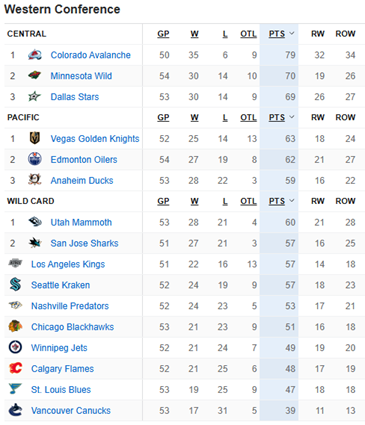 Things are a lot less convoluted in the West, only because the quality of the middle tier is so much worse. We also have a lot more “locks” in the West: Colorado, Minnesota, Dallas, Vegas, Edmonton. I’d also be pretty surprised at this point if the Mammoth or Kings don’t make it. It’s not that I’m in love with either of them, but they are a clear class above the teams they’re competing with, and that’s reflected in their current playoff odds (Mammoth -475, Kings -300). I’m not betting either at those numbers, but I think they’re both good enough teams to comfortably fend off the challenge of the teams they’re fighting with. If I’m right, that leaves just one more spot up for grabs, which will come down to the Ducks, Sharks, Kraken, Predators, or Jets. I am extremely out on the Kraken, I think the Jets have simply dug too big a hole to climb out of, and as much as I love how Nashville’s been playing, I think it realistically comes down to the Ducks and Sharks. It would be awesome to see Celebrini carry San Jose into the playoffs on his back, but selfishly I have a lot of pre-flop positions on the Ducks and I also think they’d be a much better watch in the first round. I love how they responded to losing nine straight, by winning seven in a row without both Troy Terry and Leo Carlsson. They’re getting both guys back soon, and Lukas Dostal has rediscovered his form. This is a really quality Ducks roster when fully healthy, and I think the talent gap between them and San Jose is just too much for the Sharks to overcome. I wouldn’t be running to bet it at -180, though. I don’t see a ton of value in the make/miss playoff markets in the West.