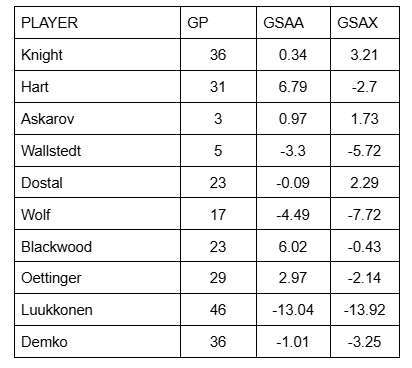 Of the goalies to debut before or around their 21st birthday, none of them really stuck. Knight, also out of Boston College, arrived straight to the NHL from the NCAA, playing four games at the end of the 2020-21 season. He settled into a backup role the following year with mediocre results, though did play a handful of AHL games in each of the next two seasons. Hart was a bit of a unicorn who never looked back after bursting onto the scene in 2018. He posted strong results in his first two seasons but hit a wall in year three before getting injured. Wallstedt and Askarov were used sparingly, appearing in just five and three games respectively in their first wo seasons, largely remaining in the AHL after their initial callups. Of all the names on the above list, none of them truly found success in their first tastes of NHL action: