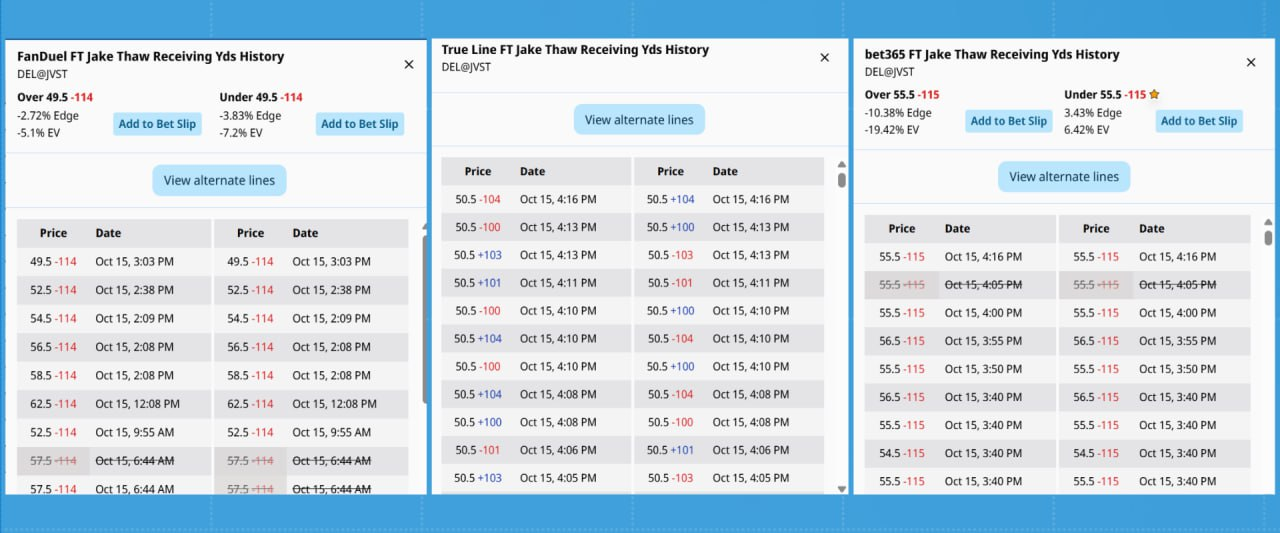 Early in the day, FanDuel steamed Thaw’s line up to 62.5 (-114) before sharp action drove it back down, settling near 49.5 (-114) by mid-afternoon. But Bet365 and a few other books never followed the correction, still hanging 55.5 (-115) long after sharper markets adjusted.