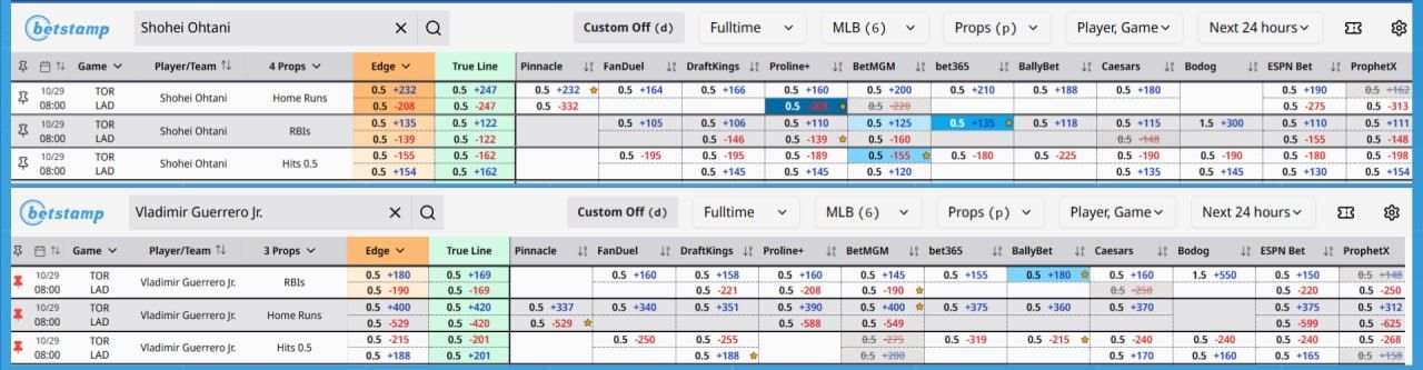 Ohtani’s home-run line has been steamed up from +181 to +230–255, signaling a notable drop in HR probability. His hits line (over 0.5) has also drifted from –252 to –195, reinforcing expectations that Toronto may pitch around him and limit his chances at the plate. Despite that, Ohtani still carries shorter prices on RBI and HR props compared to Guerrero, reflecting that when he does get pitches to hit, he’s still the greater threat to produce power.