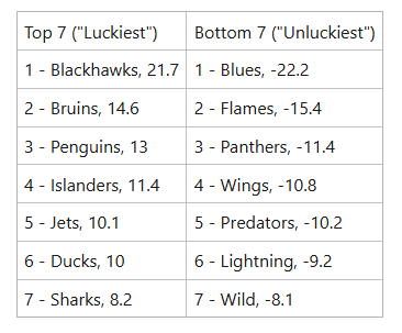 2.) Let’s see which teams have benefited the most, and least, from this early season trend. Here are the top-seven and bottom-seven teams in the NHL thus far in Goals Scored Above Expected + Goals Saved Above Expected (all strengths):