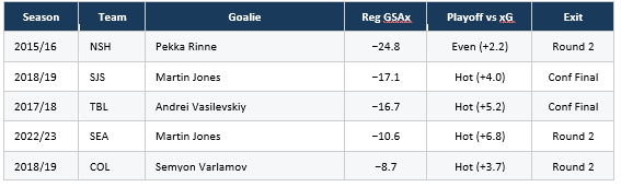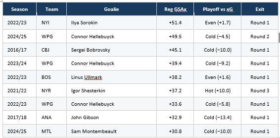 Ilya Sorokin posted plus 51.4 GSAx for the Islanders in 2022/23, the highest single season mark in the entire dataset. He ran essentially even against expected goals in the playoffs and New York lost in the first round. Sergei Bobrovsky posted plus 45.1 for Columbus in 2016/17 and his team ran cold. Linus Ullmark posted plus 38.2 for Boston in 2022/23 and was bounced in the first round. Connor Hellebuyck has appeared on this list three separate times and his teams ran cold against expected goals in every single one.