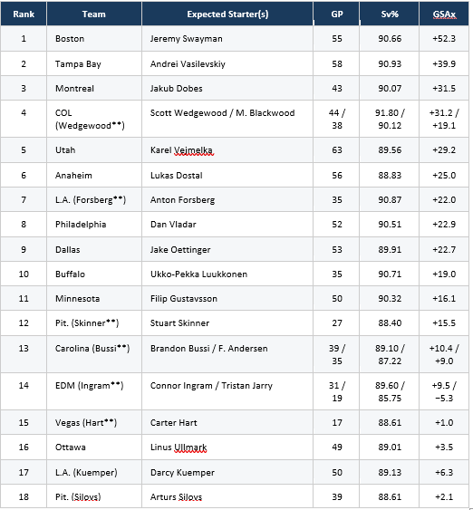 ** Uncertain starter situation. Wedgewood and Blackwood are close to 50/50 in Colorado. Hart expected to start for Vegas. Forsberg has outperformed Kuemper significantly and could start for LA. Ingram is the likely Game 1 starter for Edmonton. Bussi and Andersen are close to 50/50 in Carolina. Skinner and Silovs splitting time in Pittsburgh.