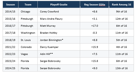 Rob Pizzola is the CEO of The Hammer Betting Network and a professional sports bettor. All statistical data sourced from Evolving Hockey. GSAx measures goals saved above expected, adjusting for the shot quality a goalie faced. Analysis covers all 144 playoff team seasons from 2014/15 through 2024/25.
