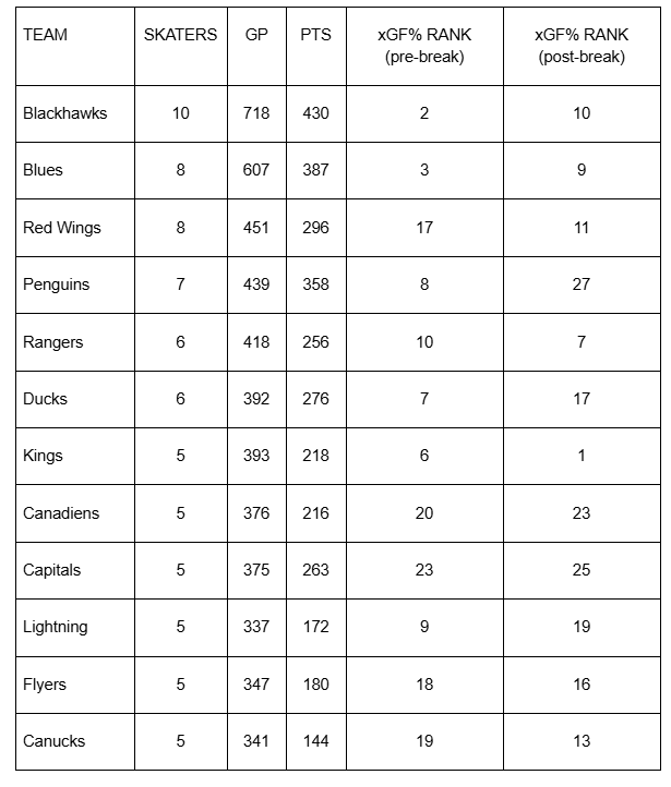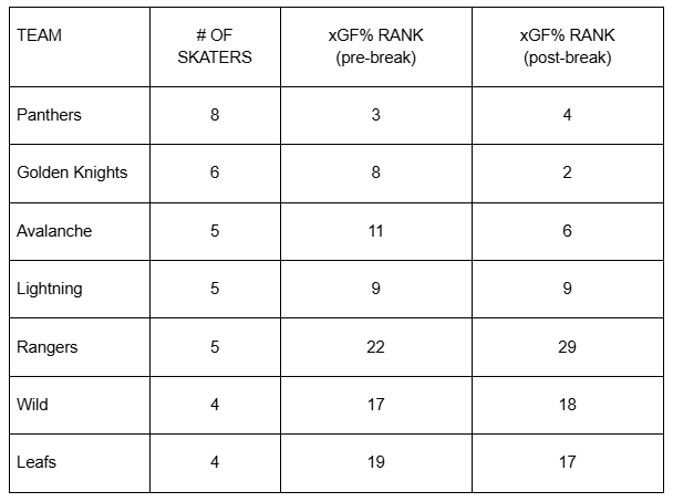 Cleary there was no dip for any of these teams. I even shortened the sample size, just looking at numbers from the month before the break and the two weeks after it. By doing so there’s obviously way more room for variance, but I wanted to get a sense of how these teams were playing right before the pause, and if they were a little slow getting back to form coming out of it: