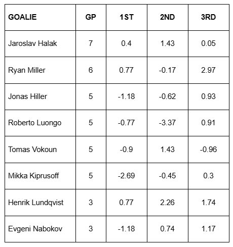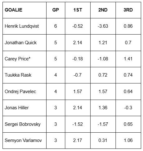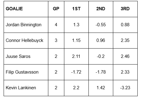 2.) I also went back and grabbed data from the goalies who partook in each of the last three international tournaments. In each of the below charts you’ll find the goalie, their total appearances at the listed tournament, and their goals saved above expected (GSAx) in each of their first three starts back (1st, 2nd, 3rd).