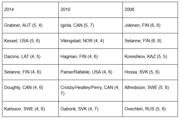 Every year there are a couple of real surprises at the top, which should be expected for such a short tournament. Anything can happen over a 4-7 game sample. In 2014, Michael Grabner scored a hat trick in an 8-4 opening loss to Finland and added another two in a 3-1 win over Norway. That was enough to make him joint-top scorer. Lauris Darzins was one off the lead for a Latvia team that won just one game. In 2010, a hat trick in a 5-4 loss to Switzerland saw Tore Vikingstad come close to matching leader Iginla in three fewer games – Norway lost every game at the tournament. In 2006, Kazakhstan scored the second-fewest goals at the tournament but Yevgeniy Koreshkov nearly won top scorer before being edged out by Olli Jokinen and Teemu Selanne, who went the distance with Finland.