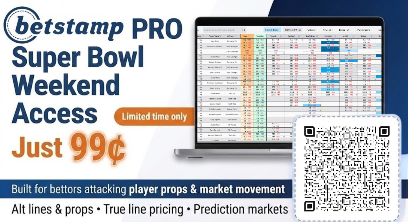 Your Super Bowl betting screen has arrived. Get Betstamp PRO for just 99¢ this weekend and see true market pricing across Super Bowl main markets and player props, including alternate lines. Secure your spot before kickoff.